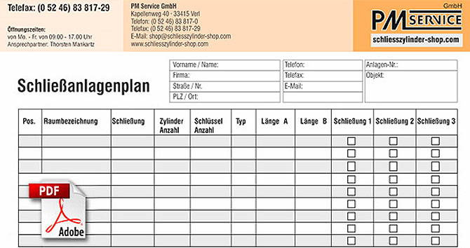 Wir helfen Ihnen gerne, von der Planung bis zur Anfertigung der Türzylinder und Sicherheitsschlüssel. Machen Sie Ihre Schließanlagen-Planung einfacher und nutzen unseren Schließanlagen-Plan als PDF Download: